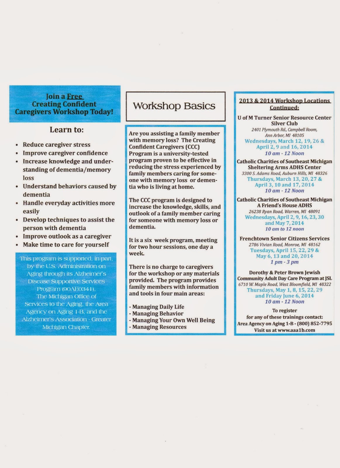 The Creating Confident Caregivers workshops are hosted in collaboration with the Area Agency on Aging-1B. This is a 6-week program for family caregivers caring for a loved one in the home.  Please see brochure for more information.