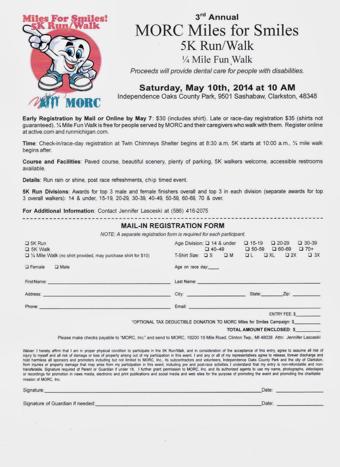 MORC, Inc. is excited to announce the 3rd Annual MORC Miles for Smiles 5k Run/Walk on Saturday, May 10th at Independence Oaks in Clarkston. MORC provides services for over 5100 men, women and children with developmental disabilities in Oakland, Macomb and Wayne counties. While their basic needs are funded there is very little funding allotted for dental care. As we know, dental issues can lead to many other health problems, especially with our vulnerable population. Everyone deserves a bright, healthy smile!
